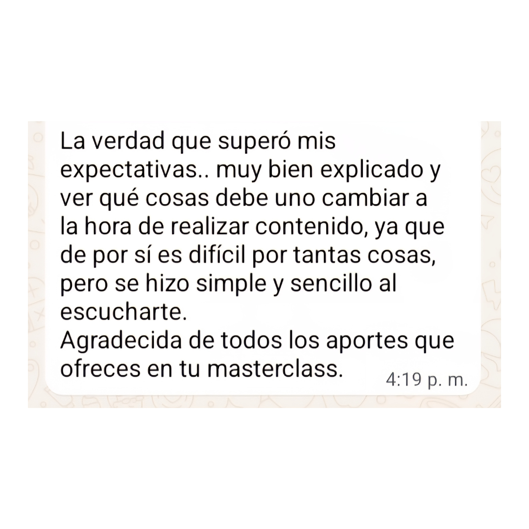 Esta MASTERCLASS no es una clase para principiantes, no voy a enseñar desde 0 a utilizar redes sociales ni aplicaciones de edición. Está pensada para personas que tienen al menos un conocimiento mínimo y básico de creación y edición de videos para redes sociales, o para personas que suelen crear contenido pero quieren aprender a mejorar esos videos.