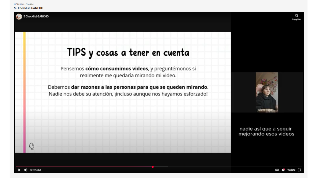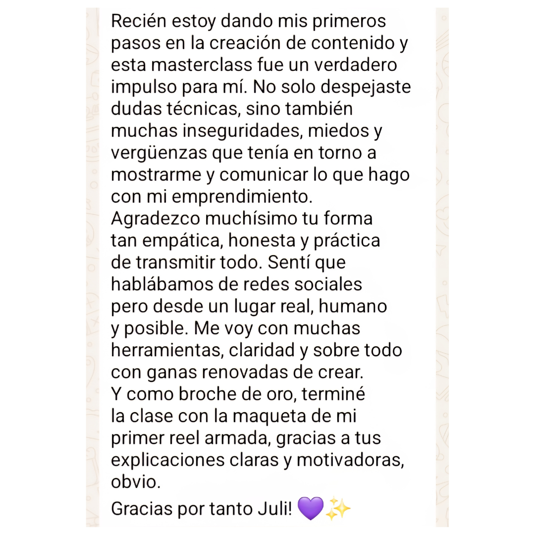 Conozco muchos de los beneficios que trae crear buen contenido orgánico para una marca, y sé que con esfuerzo y dedicación se puede porque así fue como logré resultados. Preparé esta MASTERCLASS para contarte un montón de cosas que aprendí en estos años, que creo que pueden ayudarte si estás intentando mejorar los videos de tus redes sociales.